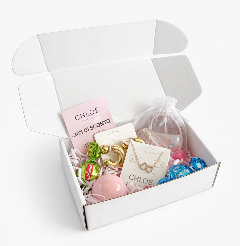 Al suo interno troverai 2 gioielli casuali gadget , accessori, cioccolatini e un codice sconto del 20% sul prossimo ordine.